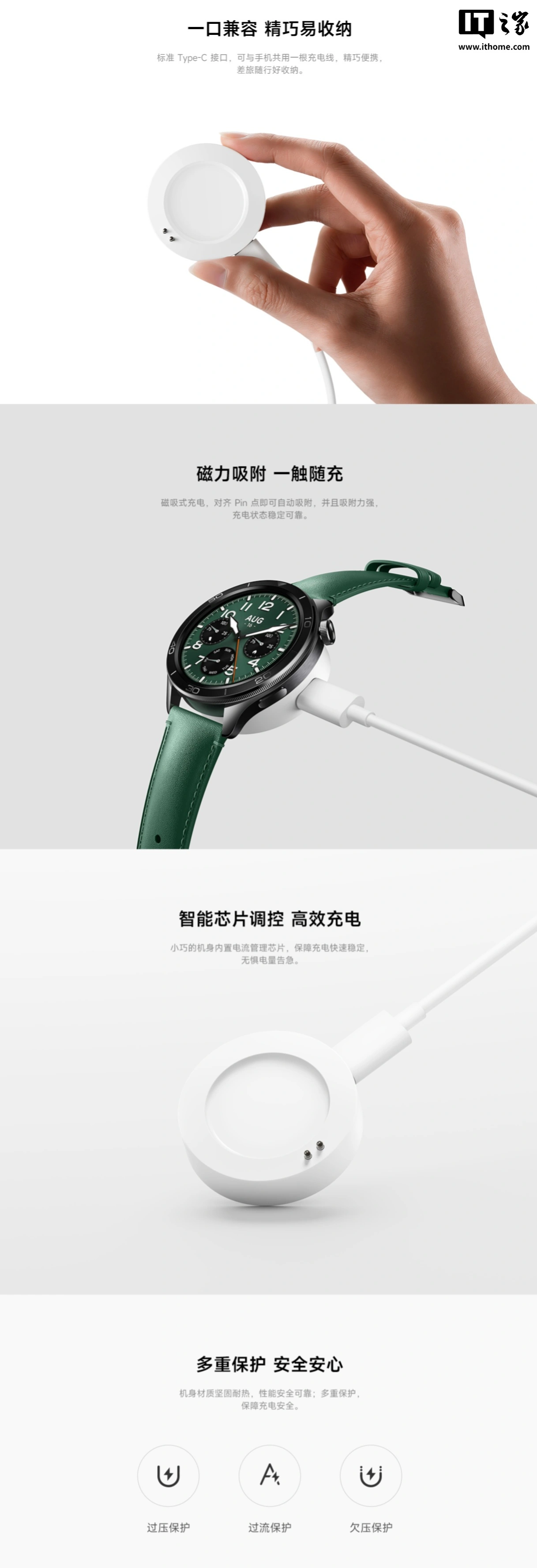 该款充电底座拥有标准Type-C接口,可与手机共用一根充电线;磁吸式设计,对齐Pin点即可自动吸附;内置电流管理芯片,可保障充电快速稳定;支持过压保护、过流保护、欠压保护。