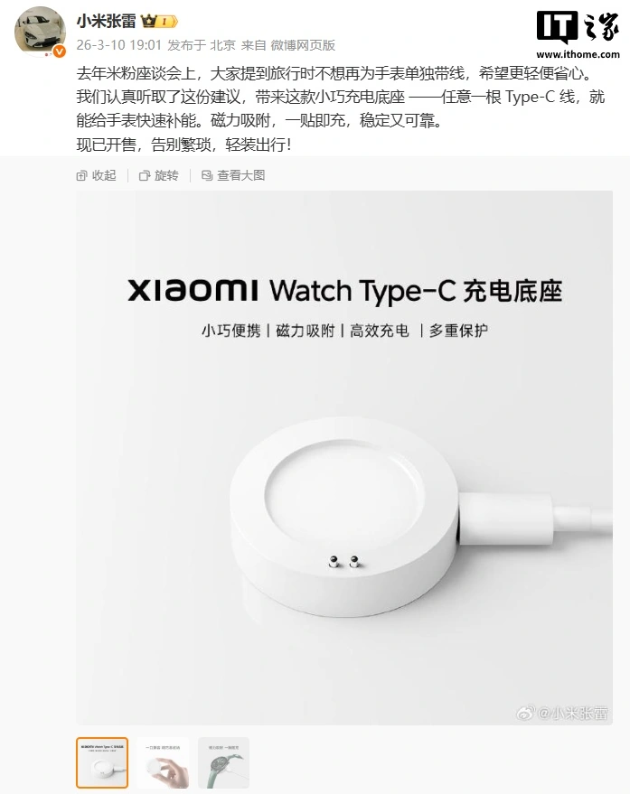 IT之家3月10日消息,小米集团手机部副总裁、可穿戴部总经理张雷今日发文称,认真听取了去年米粉座谈会上,用户提到旅行时不想再为手表单独带线的建议,现已推出小米Watch Type-C充电底座。